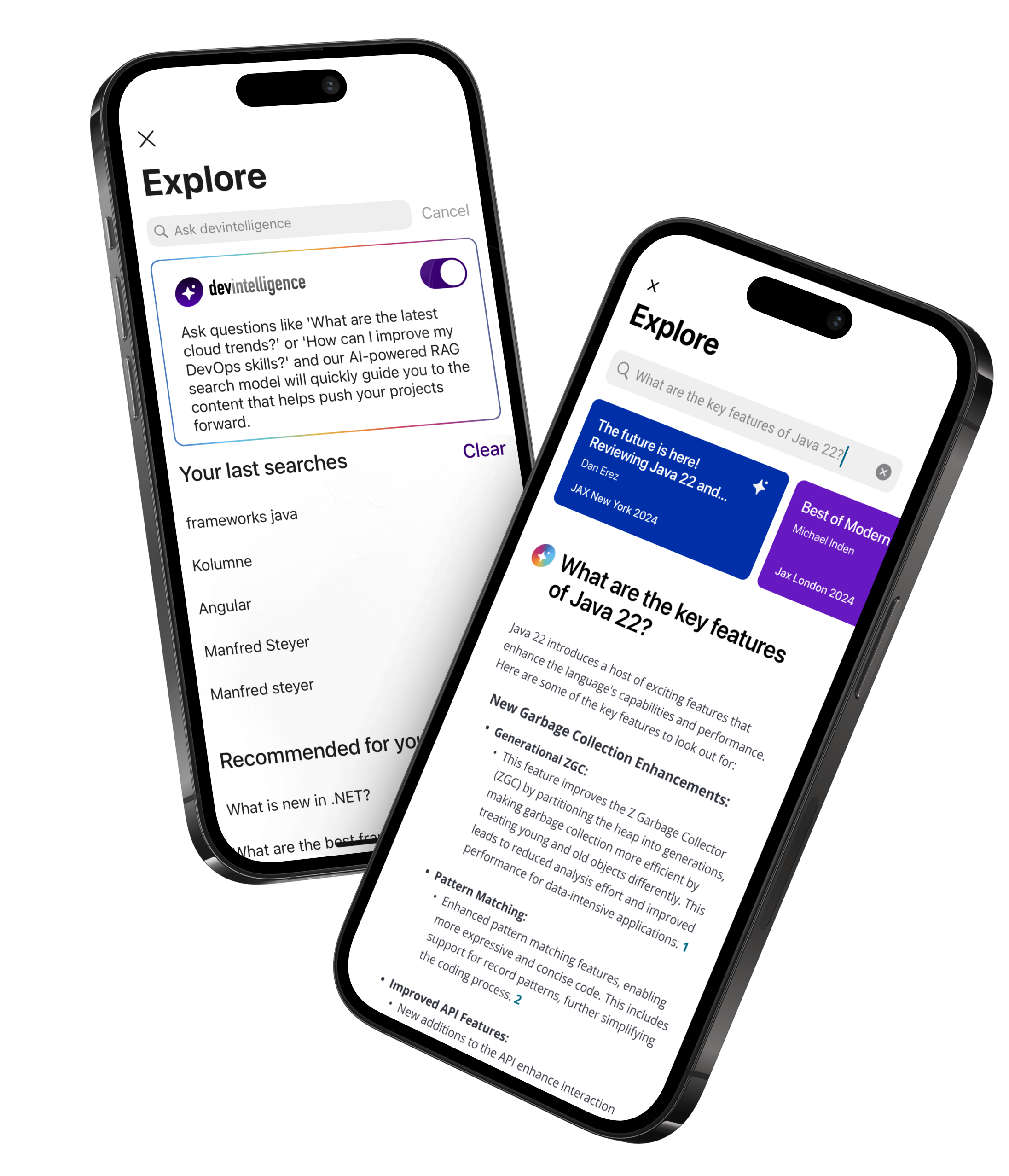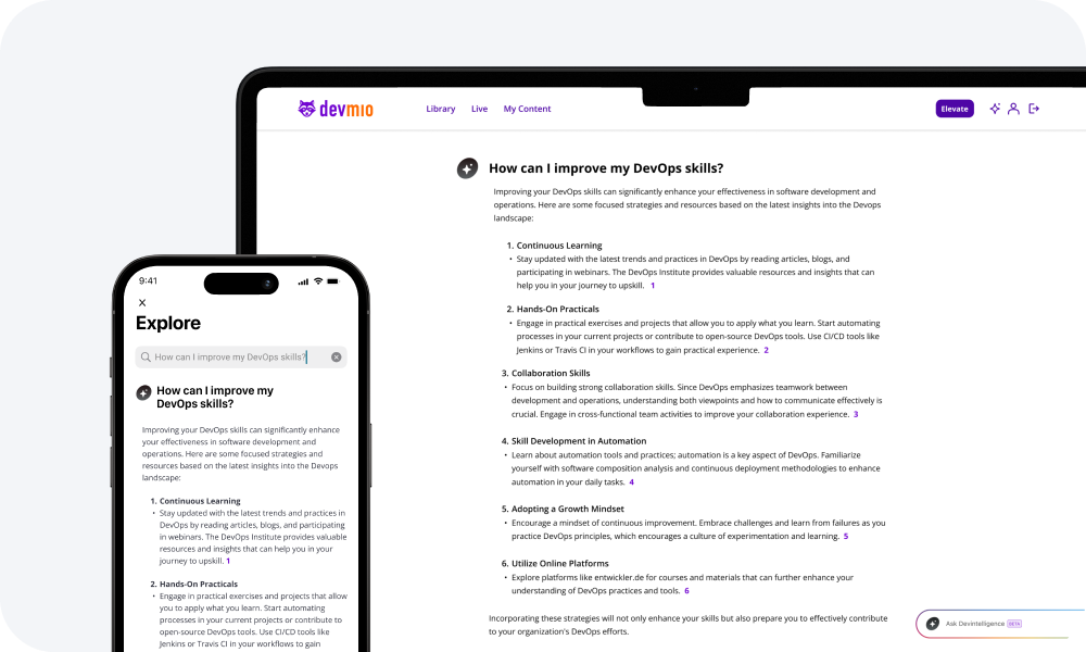 devintelligence is the AI solution for software professionals. By combining the capabilities of advanced LLMs with editorially verified, up-to-date content from our database, devintelligence offers a completely new way for software professionals to access and utilize critical knowledge.